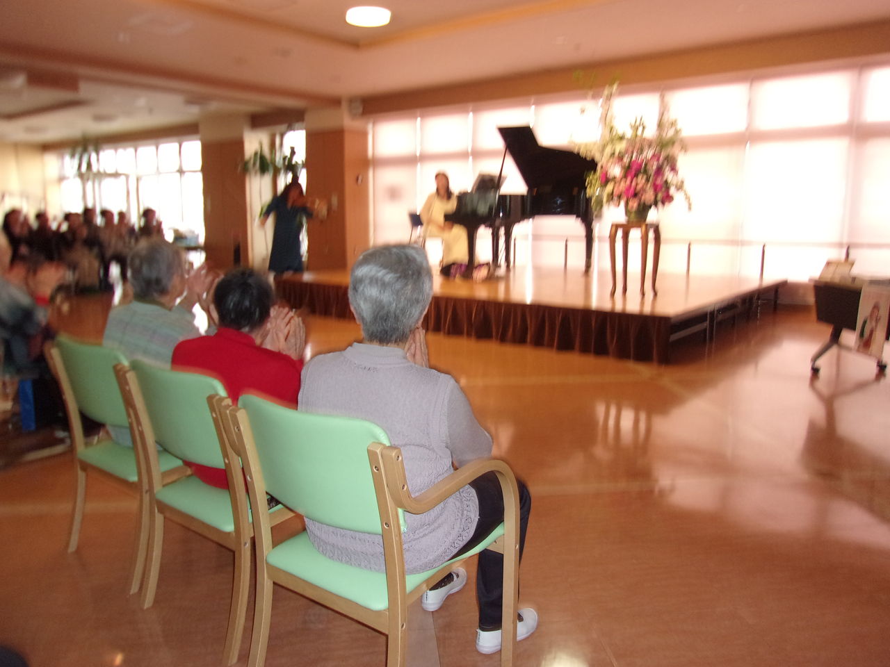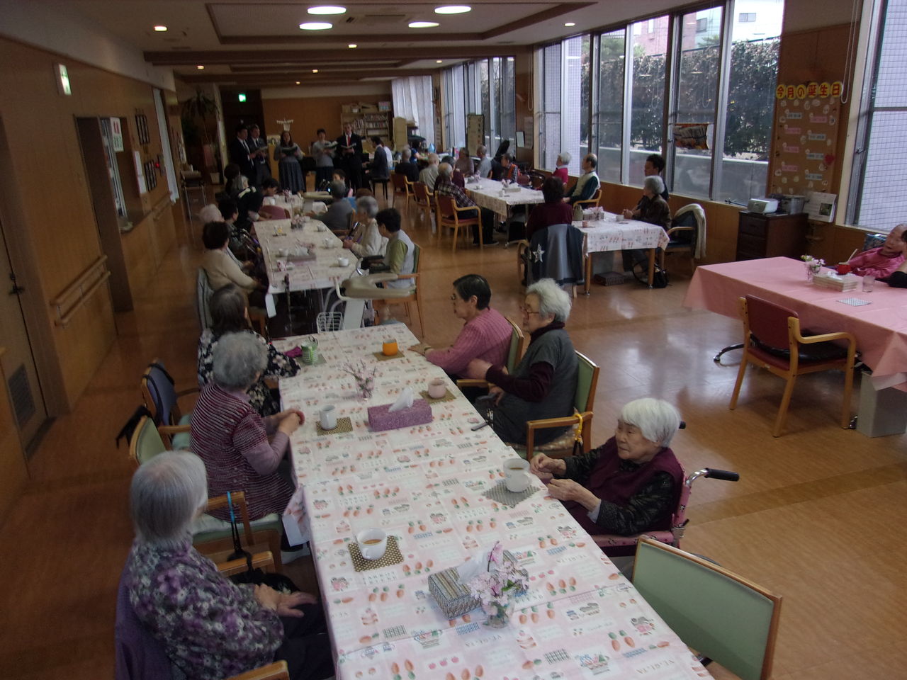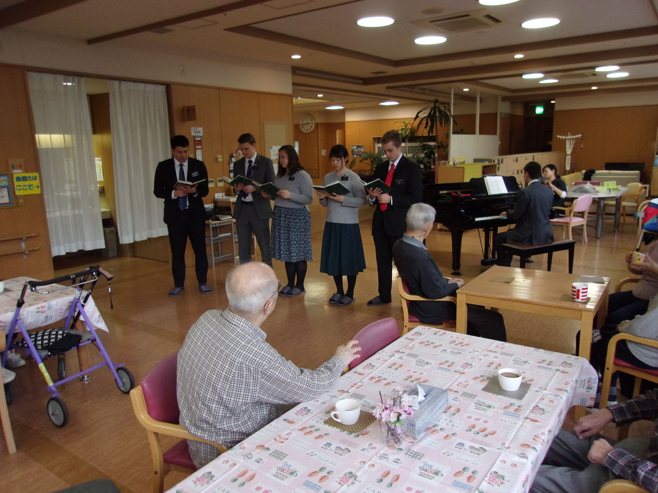 2017年04月12日 イースター?喫茶を開催しました。 まずはみんなで喫茶店の準備をしました。皆様ワイワイ楽しみながら会場づくりを手伝ってくださいました。留学生の方々がピアノ演奏と歌を披露してくださいました。イースターって何???ほとんどの皆様が名前さえ聞いたことがありませんでした。留学生の方々からイースターについて各国々のお話をしていただきました。「え~そうなの?!」と解ったかどうかは・・・演奏後は留学生の方々と交流を深めました。ボランティアさんもウエイトレスでお手伝いいただきました。イースターと言う聞きなれない言葉でした。気持ちも新たに生まれ変わり、皆様いつまでも若々しい気持ちでいていただけると幸いです。 タグ :#西野デイサービスセンター