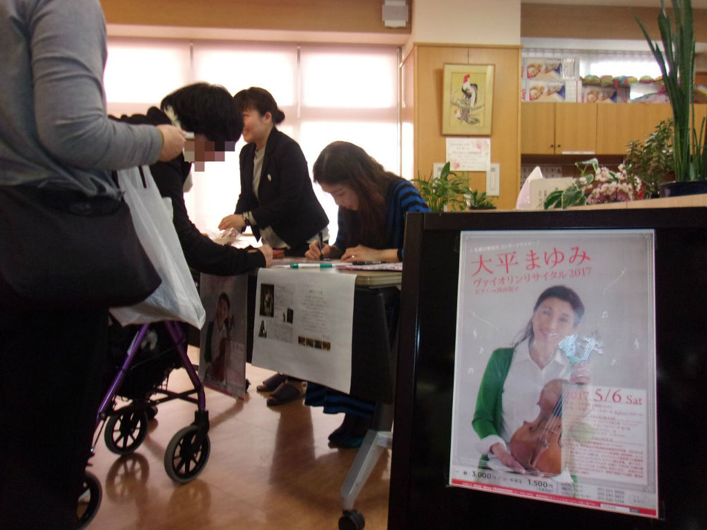 2017年04月17日 ヴァイオリンコンサート開催!! 本日、西野ケアセンターにおいて大平まゆみ氏のヴァイオリンコンサートが開催されました。ヴァイオリンとピアノの二重奏でクラシックから、童謡、歌謡曲まで幅広く演奏をしていただきました。 コンサートの途中、ステージから降りてきて、演奏しながら会場を歩いてくださいました!すぐ目の前でヴァイオリンの音色を聞く事ができ、皆さん本当に感動をされていました。 コンサート終了後には、サイン会をおこないました!!皆さん本当に嬉しそうにされていました今回で13回目となるコンサートとの事でした!これからも是非来ていただけたら嬉しいですね タグ :#西野デイサービスセンター