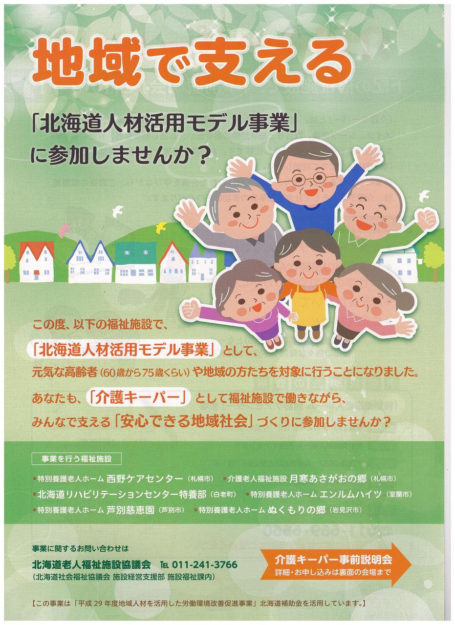 西野ケアセンターは「北海道人材活用モデル事業」を行う福祉施設として、みんなで支える「安心できる地域社会」づくりをテーマに、元気高齢者や地域の方たちを対象に「介護キーパー」として施設で働いていただける方と一緒に仕事をしています。