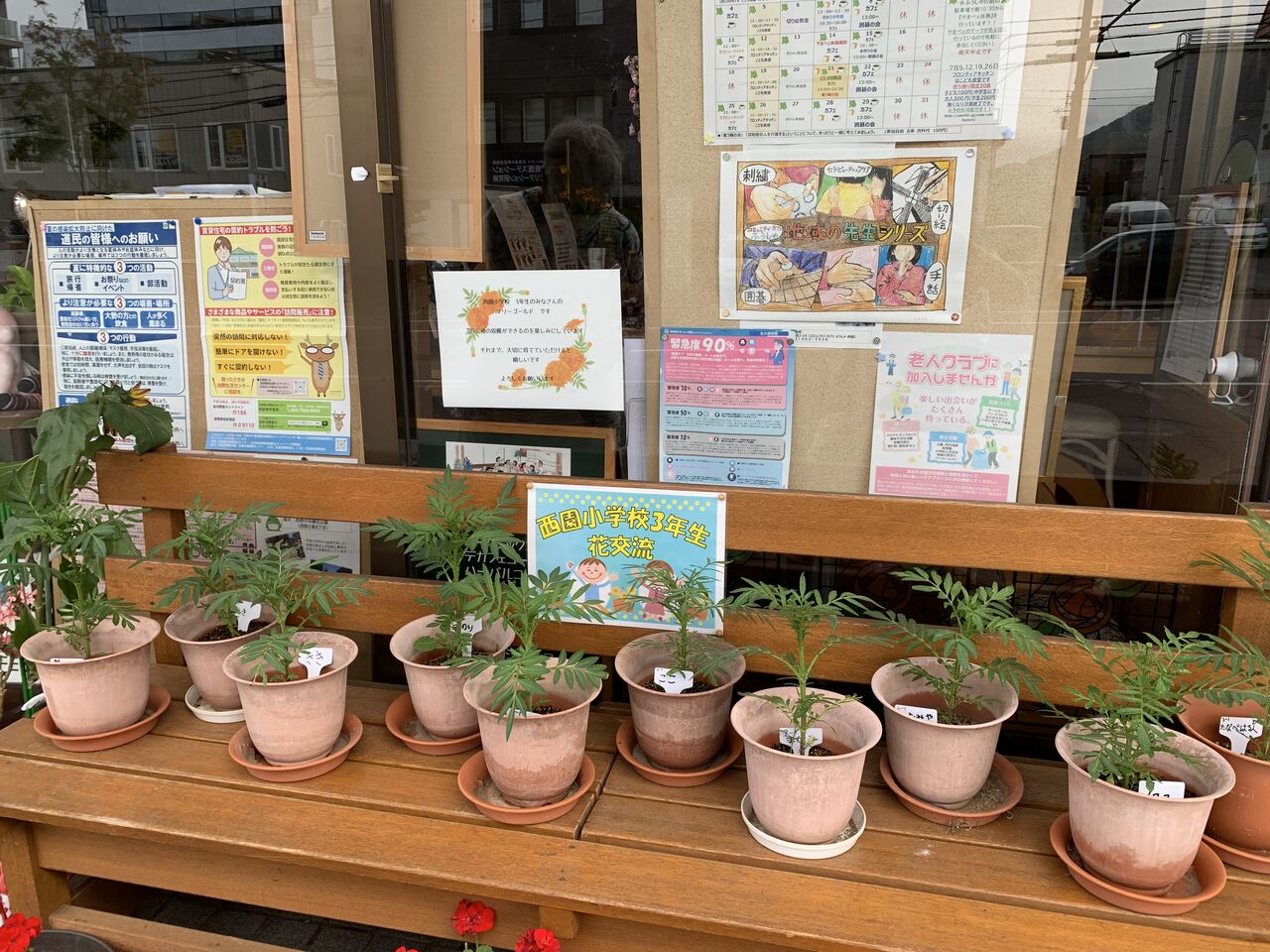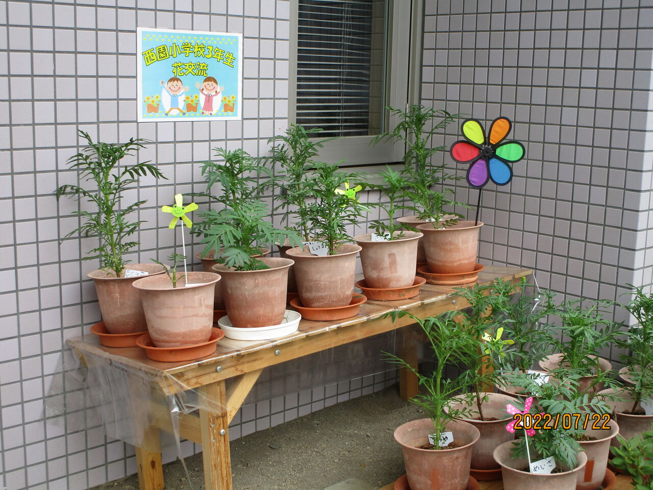 西園小学校の3年生の皆さんが約100個の鉢を持って、花交流に来てくださいました